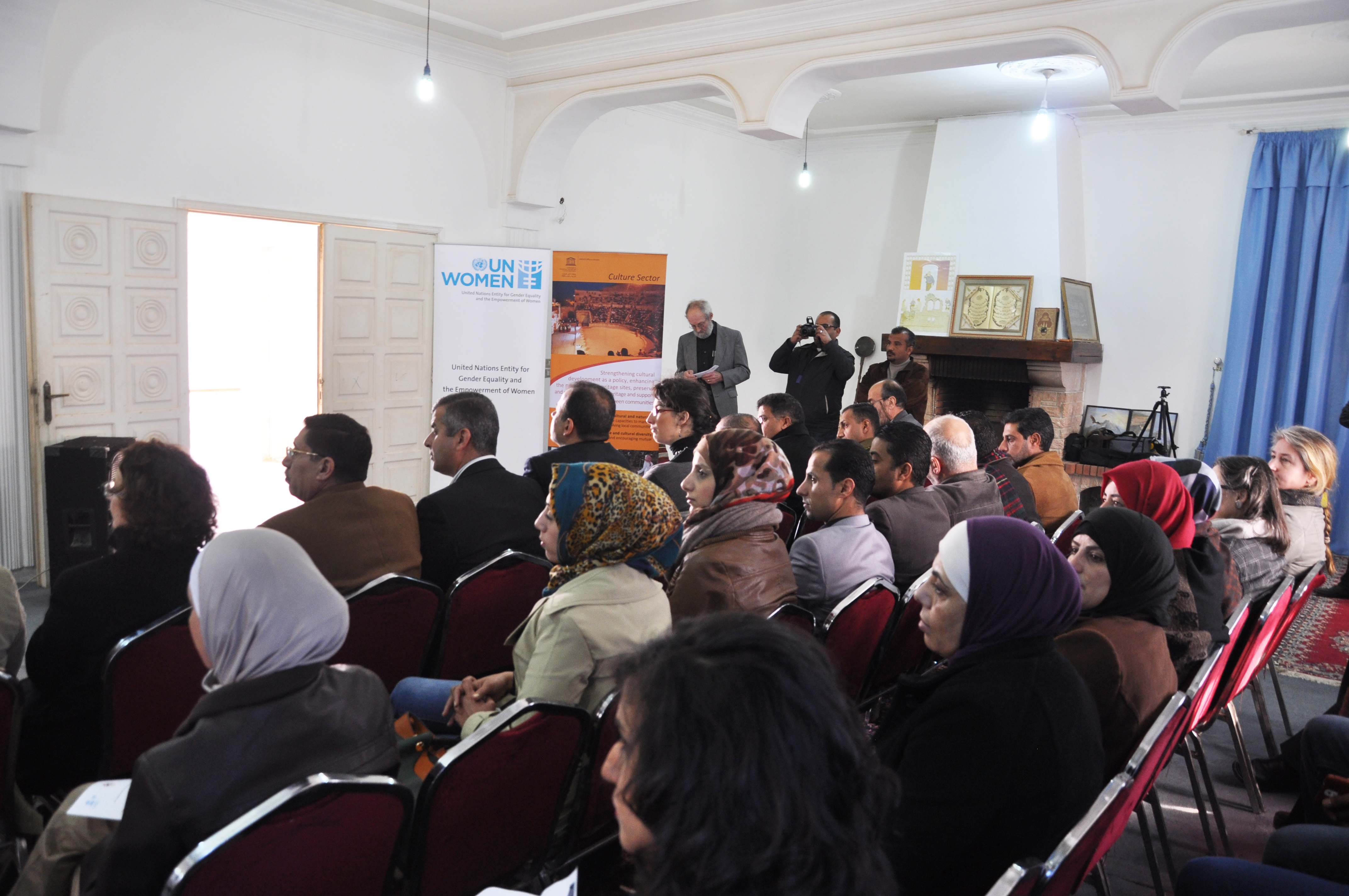 On January 18, 2014, the empowerment project had its formal opening in the heritage center at Umm el-Jimal. About 120 dignitaries and local residents gathered with the women to listen to hopeful inaugural speeches by representatives of the various agencies involved, including, among others, UNESCO, UN Women, the Department of Antiquities and the Ministries of Planning and Tourism. One of the group of thirty women who also spoke expressed her delight and excitement for this reinvigoration of the cooperative, as well as her hope that their empowerment would lead to careers for young women as they graduate from local schools. We feel that the large turnout indicates that the community, including its men, is ready to give its women the freedom to engage in publicly visible service careers.