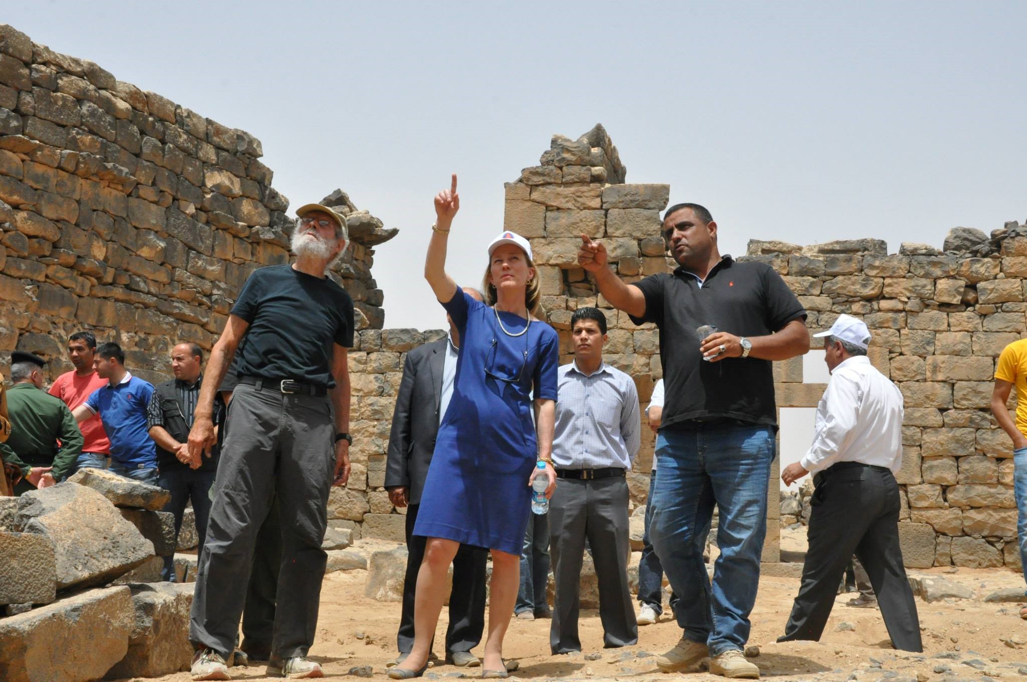 Celebration. June 6, 2015 U. S. Ambassador Alice Wells came to celebrate the wrap-up of the House XVII-XVII Preservation, enabled by grants from the Ambassadors Fund for Cultural Preservation. Here Muaffaq Hazza explains a feature of the upper levels of House XVIII. See “AFCP Grant Wrap Event” on the UJP blog for more.